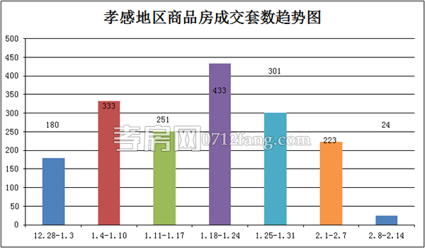從2016年2月8日到2016年2月14日,孝感地區(qū)銷售總交易記錄24套,環(huán)比比上上周(223套)下滑約89%;成交均價4611.32元/平方米,與上上周(4591.22元/平方米)幾乎持平;成交面積2569.44平方米,環(huán)比上上周(26195.00平方米)下降約90%;成交總金額環(huán)比上上周下降約90%。