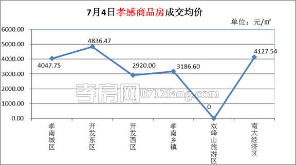 7月4日,全市的成交均價為4129.78元/㎡。其中孝南城區(qū)為627.31元/㎡,開發(fā)東區(qū)為1534.64元/㎡,開發(fā)西區(qū)為2920.00元/㎡,孝南鄉(xiāng)鎮(zhèn)為3186.60元/㎡,南大經(jīng)濟(jì)區(qū)為1771.82/㎡。