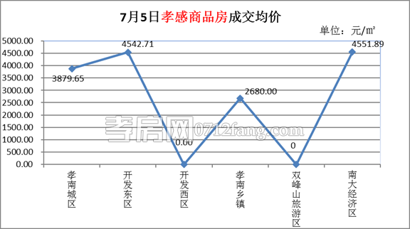 7月5日,全市的成交均價(jià)為4401.75元/㎡。其中孝南城區(qū)為3879.65元/㎡,開發(fā)東區(qū)為4542.71元/㎡,孝南鄉(xiāng)鎮(zhèn)為2680.00元/㎡,南大經(jīng)濟(jì)區(qū)為4551.89/㎡。