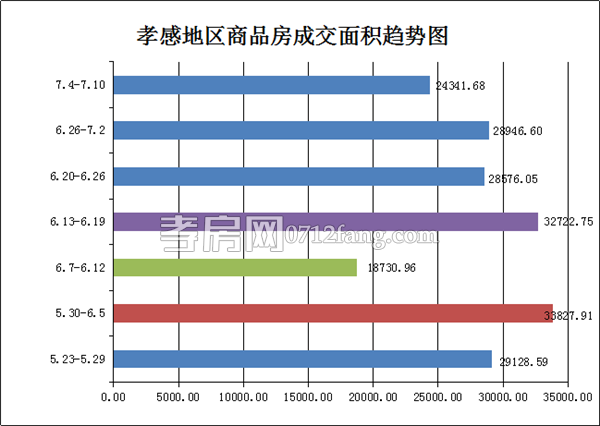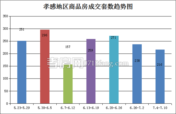 從2016年7月4日到2016年7月10日,孝感地區(qū)銷售總交易記錄216套,環(huán)比比上上周(238套)下降約9.24%;成交均價4148.66元/平方米,與上上周(6850.85元/平方米)上升約39.44%;成交面積24341.68平方米,環(huán)比上上周(28946.60平方米)上升約15.91%;成交總金額環(huán)比上上周上升約49.08%。