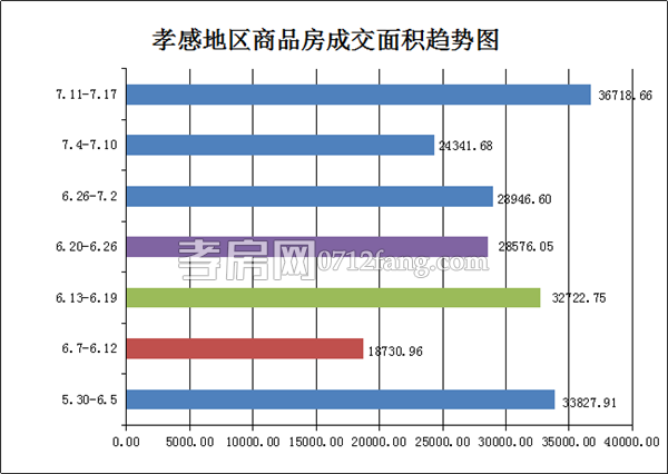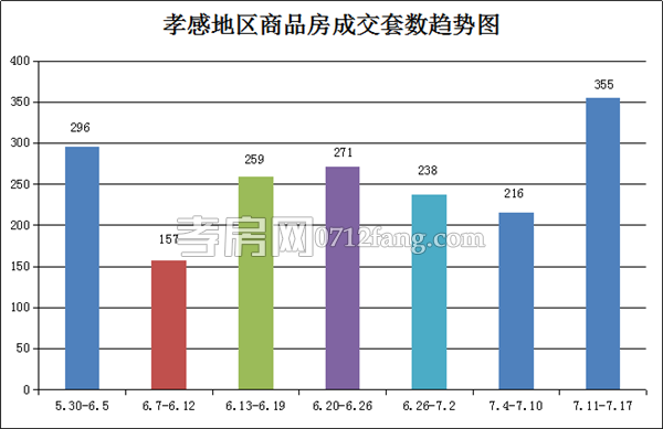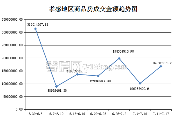 據(jù)孝房網(wǎng)數(shù)據(jù)研究統(tǒng)計,從2016年7月11日到2016年7月17日,孝感地區(qū)銷售總交易記錄355套,面積為36718.66平方米,金額為167387702.21元,均價為4558.65元/平方米。