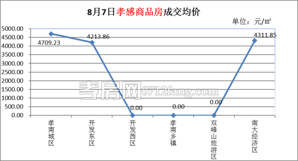 8月7日,全市的成交均價(jià)為4409.57元/㎡。其中孝南城區(qū)為4709.23元/㎡,開發(fā)東區(qū)為4213.86元/㎡,南大經(jīng)濟(jì)區(qū)4311.85元/㎡。