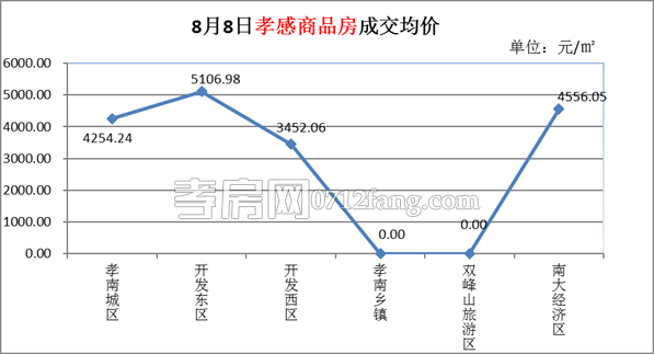 8月8日,全市的成交均價(jià)為4796.65元/㎡。其中孝南城區(qū)為4254.24元/㎡,開發(fā)東區(qū)為5106.98元/㎡,開發(fā)西區(qū)為3452.06元/㎡,南大經(jīng)濟(jì)區(qū)4556.05元/㎡。
