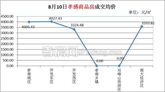 8月10日,全市的成交均價(jià)為3770.69元/㎡。其中孝南城區(qū)為4005.43元/㎡,開(kāi)發(fā)東區(qū)為4027.43元/㎡,開(kāi)發(fā)西區(qū)為3324.48元/㎡,南大經(jīng)濟(jì)區(qū)3593.82元/㎡。