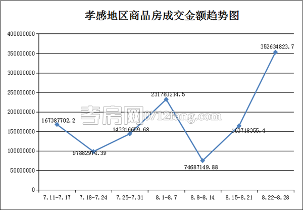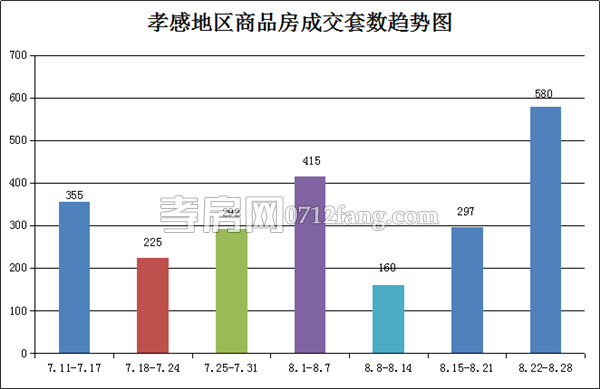 從2016年8月22日到2016年8月28日,8月26日房管局?jǐn)?shù)據(jù)缺失,孝感地區(qū)六天銷售總交易記錄580套,環(huán)比比上上周(297套)上漲約95.29%;成交均價(jià)5261.66元/平方米,環(huán)比上上周(4642.21元/平方米)上漲約13.34%;成交面積67019.73平方米,環(huán)比上上周(35267.36平方米)上漲約90.03%;成交總金額環(huán)比上上周上漲約115.39%。