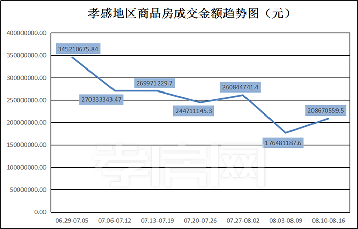據(jù)孝房網(wǎng)數(shù)據(jù)研究顯示,從2020年08月10日到08月16日,孝感地區(qū)銷售總交易記錄285套,建面約36565.7平方米,金額為208670559.52元,均價(jià)為5706.73元/平方米。