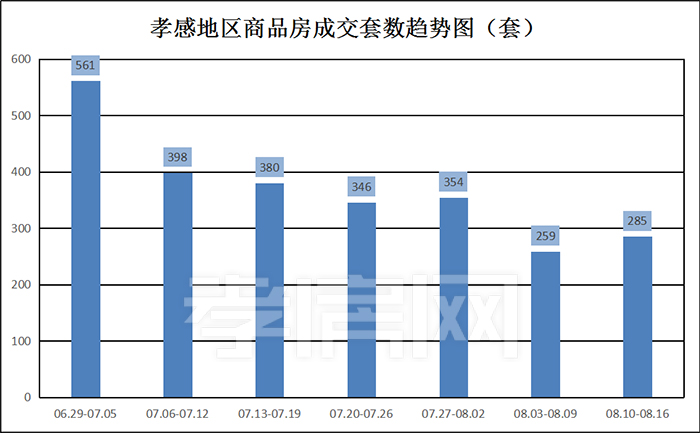從2020年08月10日到08月16日,孝感地區(qū)銷售總交易記錄285套,環(huán)比上周(259套)上升約10.03%;成交均價(jià)5706.73元/平方米,環(huán)比上周(6360.8元/平方米)下降約10.28%;成交建面約36565.7平方米,環(huán)比上周(27745.13平方米)上升約31.79%;成交總金額208670559.52元,環(huán)比上周(176481187.57元)上升約18.24%。