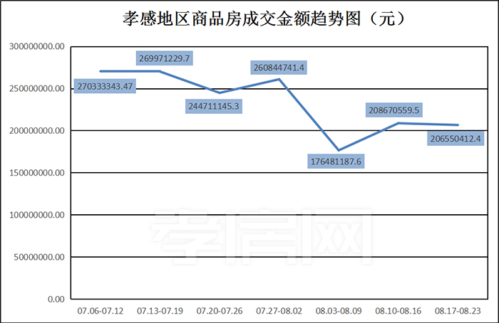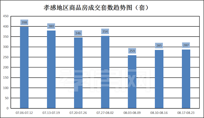 從2020年08月17日到08月23日,孝感地區(qū)銷售總交易記錄287套,環(huán)比上周(285套)上升約0.7%;成交均價5878.81元/平方米,環(huán)比上周(5706.73元/平方米)上升約3.02%;成交建面約35134.74平方米,環(huán)比上周(36565.7平方米)下降約3.91%;成交總金額206550412.35元,環(huán)比上周(208670559.52元)下降約1.02%。