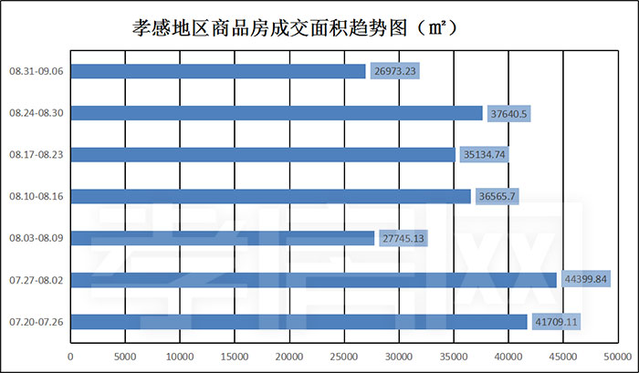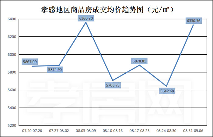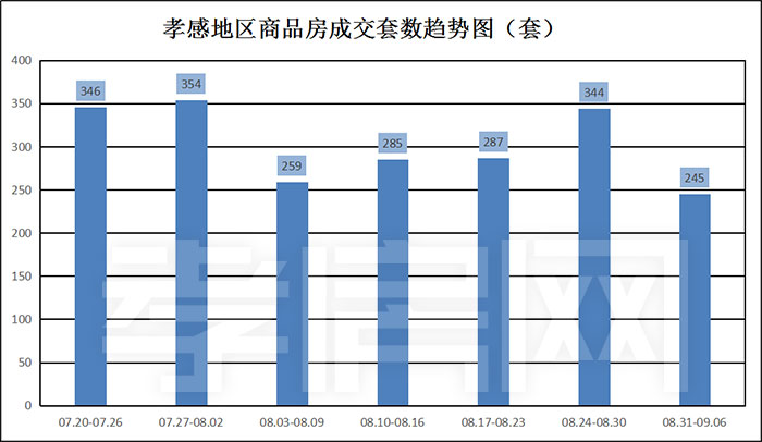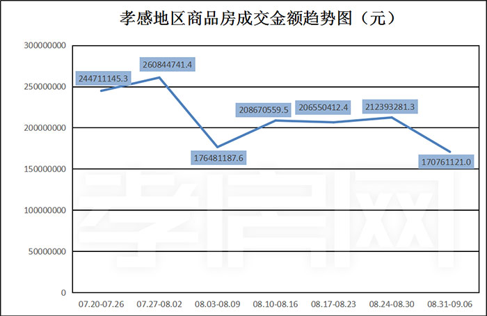 據(jù)孝房網數(shù)據(jù)研究顯示,從2020年08月31日到09月06日,孝感地區(qū)銷售總交易記錄245套,建面約26973.23平方米,金額為170761121元,均價為6330.76元/平方米。
