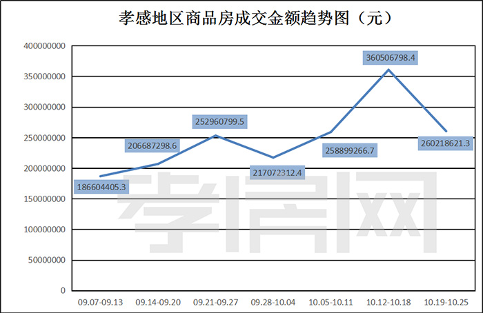 從2020年10月19日到10月25日,孝感地區(qū)銷售總交易記錄333套,環(huán)比上周(489套)下降約46.85%;成交均價(jià)7106.20元/平方米,環(huán)比上周(6586.11元/平方米)上漲約7.32%;成交建面約36618.51平方米,環(huán)比上周(54737.46平方米)下降約49.48%;成交總金額260218621.3元,環(huán)比上周(360506798.3元)下降約38.54%。
