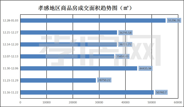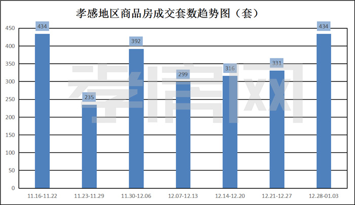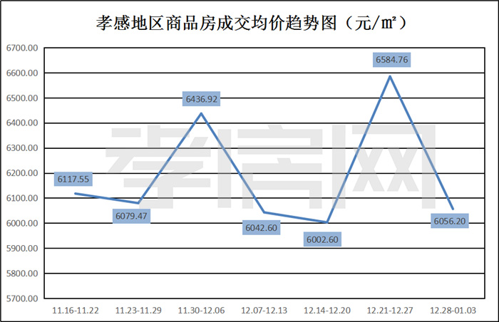 ? ? ? ?據(jù)孝房網(wǎng)數(shù)據(jù)研究顯示,從2020年12月28日到2021年1月3日,孝感地區(qū)銷售總交易記錄434套,建面約55296.35平方米,金額為334885699.46元,均價為6056.20元/平方米。