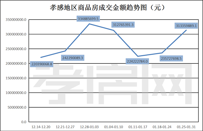? ? ? ?從2021年1月25日到1月31日,孝感地區(qū)銷售總交易記錄490套,環(huán)比上周(332套)上漲約47.59%;成交均價6102.51元/平方米,環(huán)比上周(6472.73元/平方米)下降約5.72%;成交建面約51349.35平方米,環(huán)比上周(36418.57平方米)上漲約40.5%;成交總金額313359889.12元,環(huán)比上周(235727698.45元)上漲約32.93%。