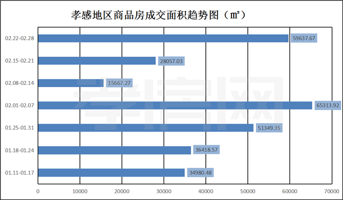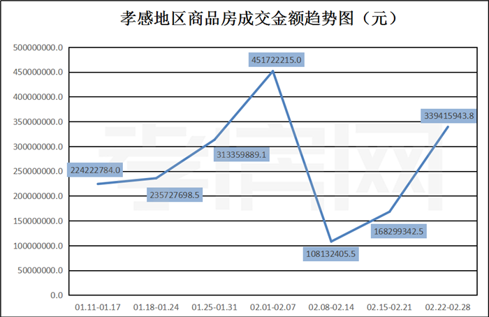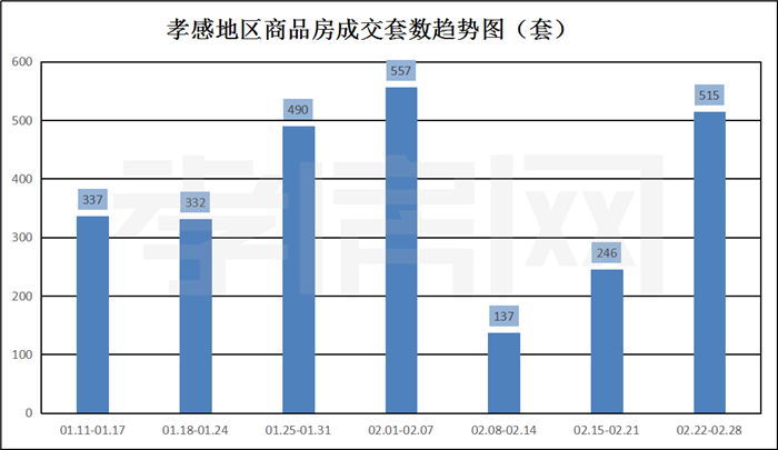 ? ? ? ?從2021年2月22日到2月28日 ,孝感地區(qū)銷售總交易記錄515套,環(huán)比上周(246套)上漲約109.35%;成交均價(jià)5691.30元/平方米,環(huán)比上周(5998.47元/平方米)下降約5%;成交建面約59637.67平方米,環(huán)比上周(28057.03平方米)上漲約113%;成交總金額339415943.81元,環(huán)比上周(168299342.48元)上漲約102%。