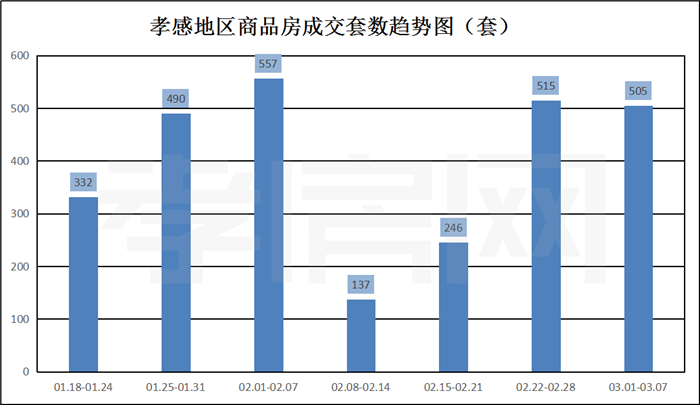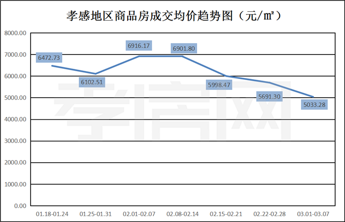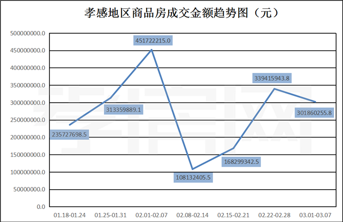 ? ? ? ?從2021年3月1日到3月7日 ,孝感地區(qū)銷售總交易記錄505套,環(huán)比上周(515套)下降約1.9%;成交均價5033.28元/平方米,環(huán)比上周(5691.30元/平方米)下降約12%;成交建面約59972.92平方米,環(huán)比上周(59637.67平方米)上漲約1%;成交總金額301860255.80元,環(huán)比上周(339415943.81元)下降約11%。