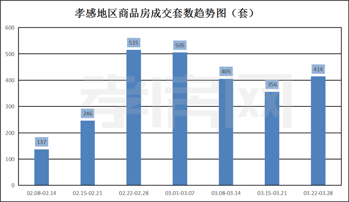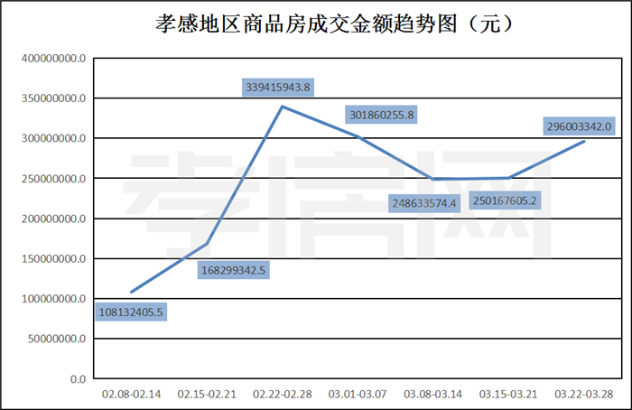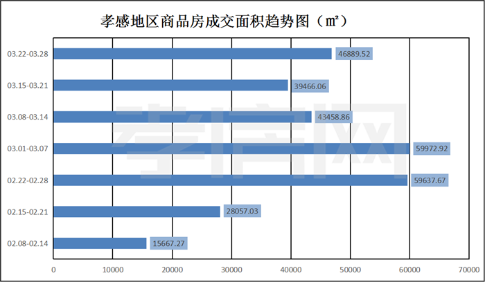 ? ? ? ?據(jù)孝房網(wǎng)數(shù)據(jù)研究顯示,從2021年3月22日到3月28日,孝感地區(qū)銷售總交易記錄414套,建面約46889.52平方米,金額為296003341.96元,均價為6312.78元/平方米。