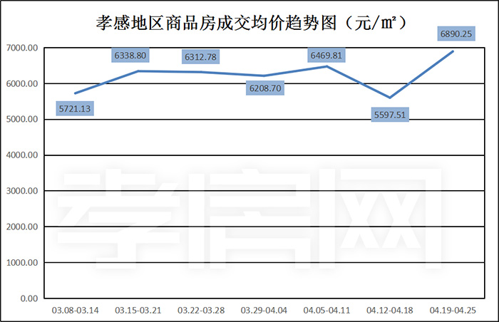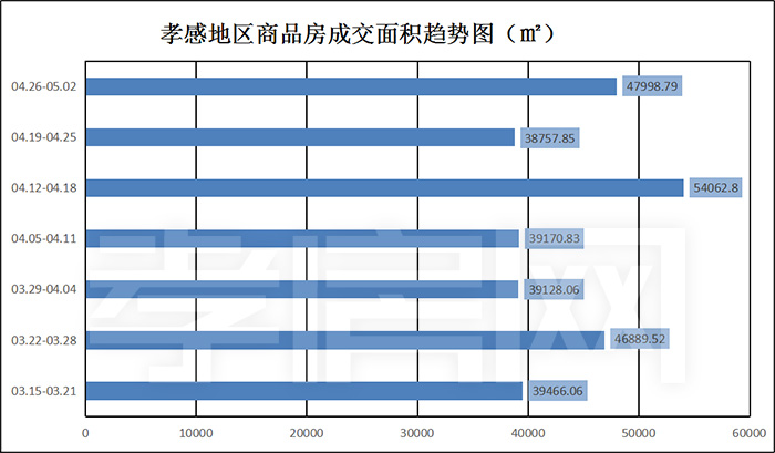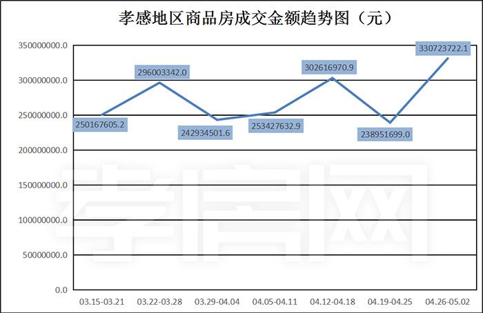 ? ? ? ?從2021年4月26日到5月02日 ,孝感地區(qū)銷售總交易記錄462套,環(huán)比上周(373套)上漲約23.86%;成交均價6890.25元/平方米,環(huán)比上周(6165.25元/平方米)上漲約11.76%;成交建面約47998.79平方米,環(huán)比上周(38757.85平方米)上漲約23.84%;成交總金額330723722.07元,環(huán)比上周(238951698.95元)上漲約38.41%。