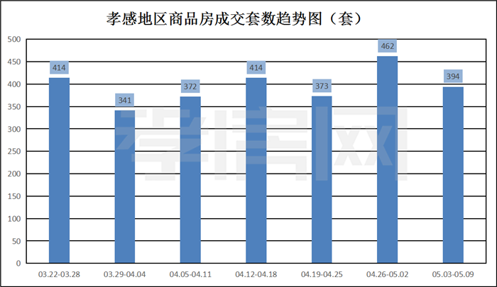 ? ? ? ?從2021年4月26日到5月02日 ,孝感地區(qū)銷售總交易記錄394套,環(huán)比上周(462套)下降約14.7%;成交均價(jià)6560.21元/平方米,環(huán)比上周(6890.25元/平方米)下降約5%;成交建面約44051.1平方米,環(huán)比上周(47998.79平方米)下降約8%;成交總金額288984609.98元,環(huán)比上周(330723722.07元)下降約13%。