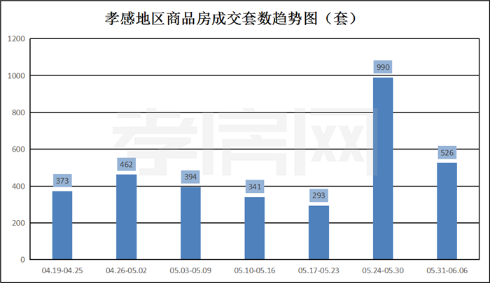 ? ? ? ?從2021年5月31日到6月6日,孝感地區(qū)銷售總交易記錄526套,環(huán)比上周(990套)下降約48.87%;成交均價(jià)6515.87元/平方米,環(huán)比上周(6481.05元/平方米)上漲約1%;成交建面約61995.13平方米,環(huán)比上周(95158.77平方米)下降約35%;成交總金額403952489.35元,環(huán)比上周(616729642.61)下降約35%。
