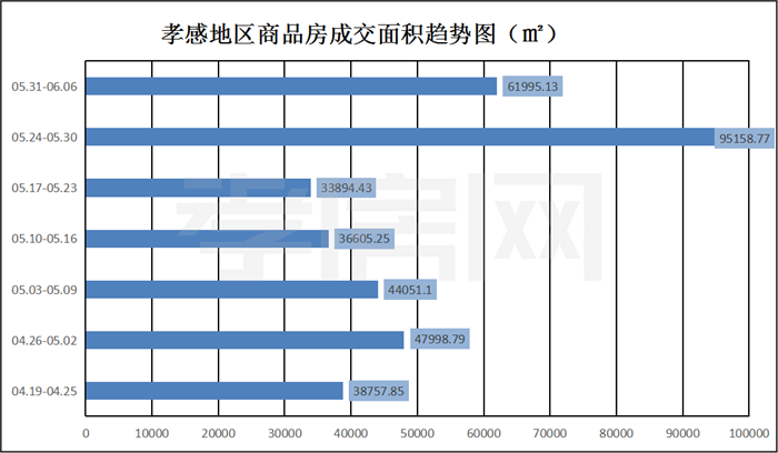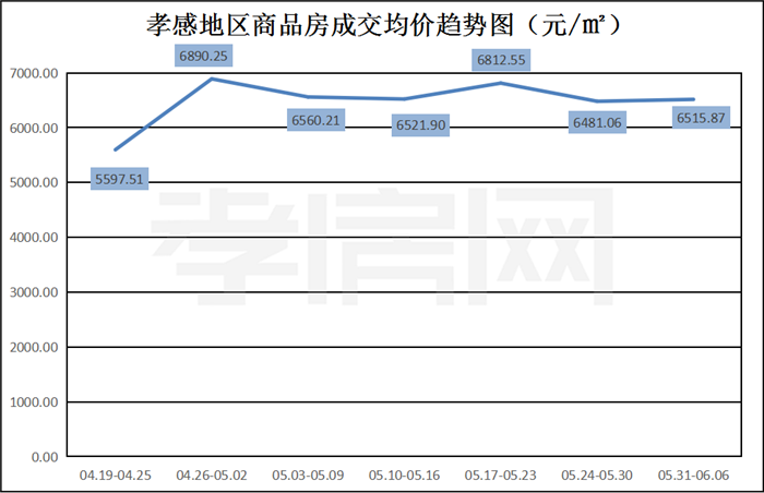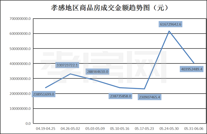 ? ? ? ?據(jù)孝房網(wǎng)數(shù)據(jù)研究顯示,從2021年5月31日到6月6日,孝感地區(qū)銷售總交易記錄526套,建面約61995.13平方米,金額為403952489.35元,均價(jià)為6515.87元/平方米。