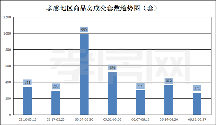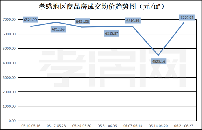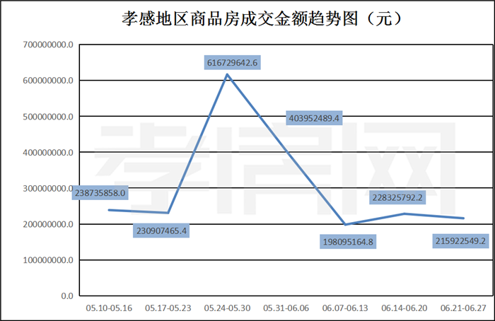? ? ? ?從2021年6月21日到6月27日 ,孝感地區(qū)銷售總交易記錄271套,環(huán)比上周(362套)下降約25.14%;成交均價6779.94元/平方米,環(huán)比上周(4528.16元/平方米)上漲約50%;成交建面約31847.26平方米,環(huán)比上周(50423.48平方米)下降約37%;成交總金額215922549.24元,環(huán)比上周(228325792.15)下降約5%。