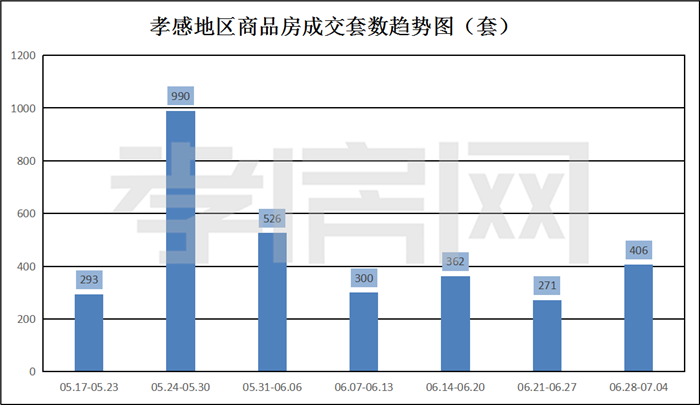 ? ? ? ?從2021年6月28日到7月4日 ,孝感地區(qū)銷售總交易記錄406套,環(huán)比上周(271套)上漲約49.82%;成交均價6041.22元/平方米,環(huán)比上周(6779.94元/平方米)下降約11%;成交建面約55134.18平方米,環(huán)比上周(31847.26平方米)上漲約73%;成交總金額333077539.65元,環(huán)比上周(215922549.24)上漲約54%。