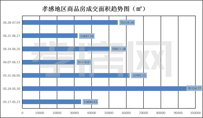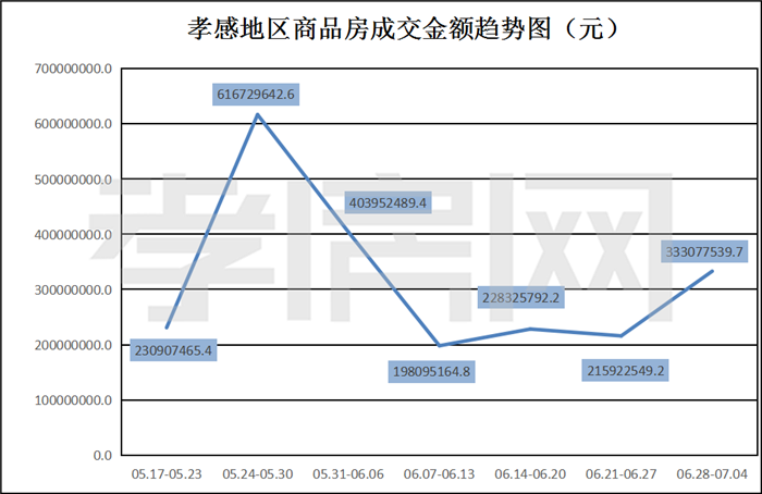? ? ? ?據(jù)孝房網(wǎng)數(shù)據(jù)研究顯示,從2021年6月28日到7月4日,孝感地區(qū)銷售總交易記錄406套,建面約55134.18平方米,金額為333077539.65元,均價為6041.22元/平方米。