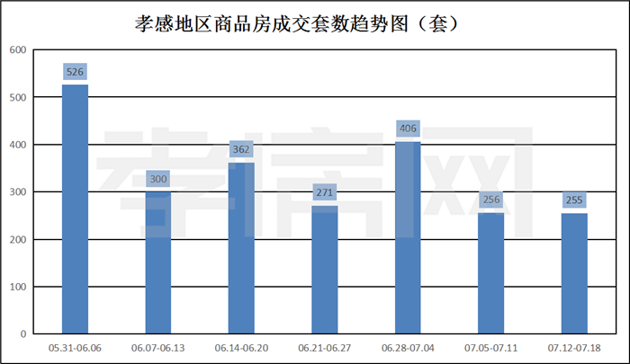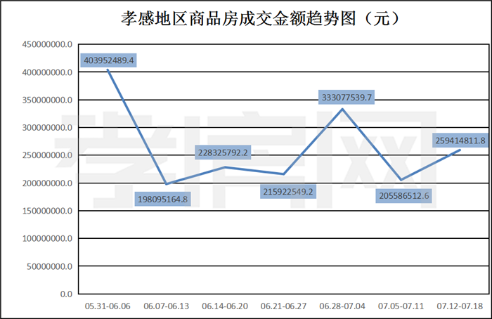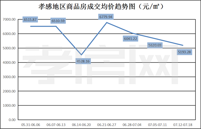 ? ? ? ?從2021年7月12日到7月18日 ,孝感地區(qū)銷售總交易記錄255套,環(huán)比上周(256套)下降約0.39%;成交均價5193.28元/平方米,環(huán)比上周(5620.69元/平方米)下降約8%;成交建面約49951.99平方米,環(huán)比上周(36576.75平方米)上漲約37%;成交總金額259414811.78元,環(huán)比上周(205586512.58)上漲約26%。
