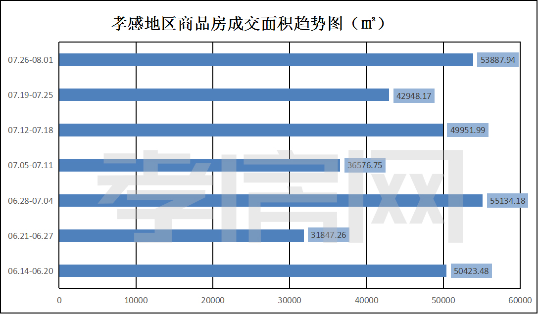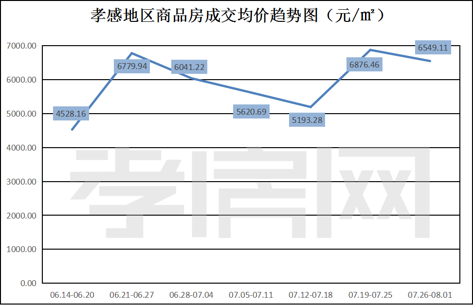 ? ? ? ?據(jù)孝房網(wǎng)數(shù)據(jù)研究顯示,從2021年7月26日到08月01日,孝感地區(qū)銷售總交易記錄451套,建面約53887.94平方米,金額為352918304.08元,均價為6549.11元/平方米。