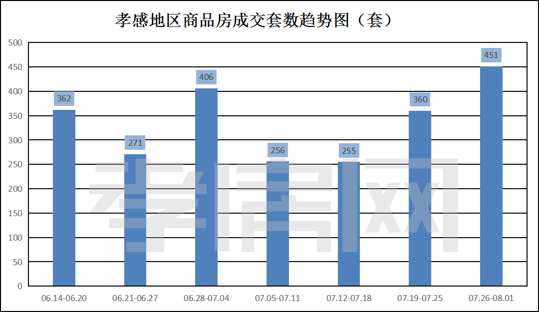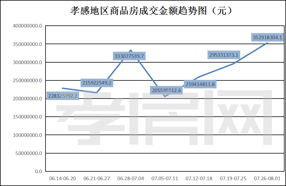 ? ? ? ?從2021年7月26日到08月01日 ,孝感地區(qū)銷售總交易記錄451套,環(huán)比上周(360套)上漲約25.28%;成交均價6549.11元/平方米,環(huán)比上周(6876.46元/平方米)下降約4.76%;成交建面約53887.94平方米,環(huán)比上周(42948.17平方米)上漲約25.47%;成交總金額352918304.08元,環(huán)比上周(295331373.07)上漲約19.5%。