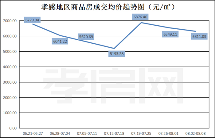 ? ? ? ?從2021年8月02日到08月08日 ,孝感地區(qū)銷售總交易記錄239套,環(huán)比上周(451套)下降約47.01%;成交均價6311.03元/平方米,環(huán)比上周(6549.11元/平方米)下降約3.64%;成交建面約25990.97平方米,環(huán)比上周(53887.94平方米)下降約51.77%;成交總金額164029664.75元,環(huán)比上周(352918304.08)下降約53.52%。