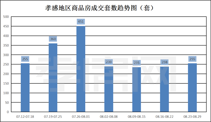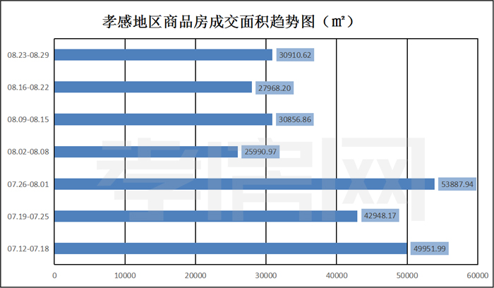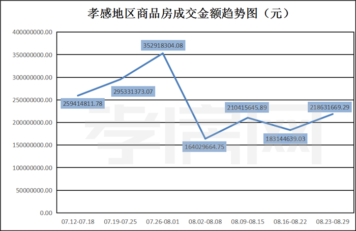 ? ? ? ?據(jù)孝房網(wǎng)數(shù)據(jù)研究顯示,從2021年8月23日到08月29日,孝感地區(qū)銷(xiāo)售總交易記錄255套,建面約30910.62平方米,金額為218631669.29元,均價(jià)為7073.03元/平方米。