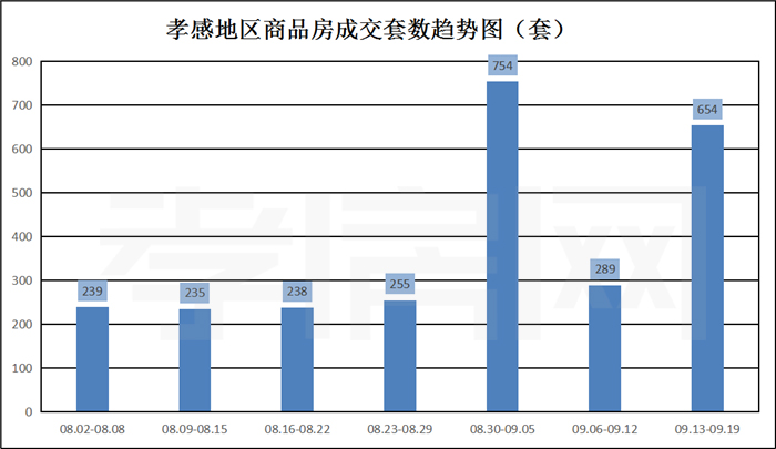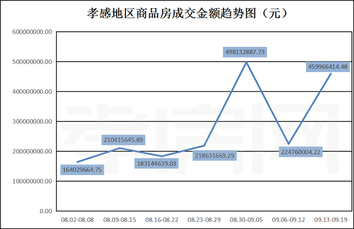 ? ? ? ?從2021年09月06日到09月12日 ,孝感地區(qū)銷售總交易記錄654套,環(huán)比上周(289套)上漲約126.3%;成交均價(jià)6247.77元/平方米,環(huán)比上周(6694.59元/平方米)下降約6.67%;成交建面約73620.86平方米,環(huán)比上周(33573.36平方米)上漲約119.28%;成交總金額459966414.48元,環(huán)比上周(224760004.22)上漲約104.65%。