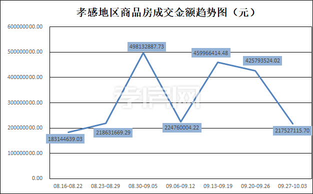 ? ? ? ?從2021年09月27日到10月03日 ,孝感地區(qū)銷售總交易記錄288套,環(huán)比上周(580套)下降約50.34%;成交均價6226.85元/平方米,環(huán)比上周(6539.41元/平方米)下降約4.78%;成交建面約34933.73平方米,環(huán)比上周(65111.91平方米)下降約46.35%;成交總金額217527115.7元,環(huán)比上周(425793524.02)下降約48.91%。