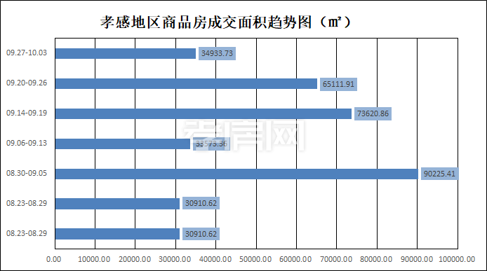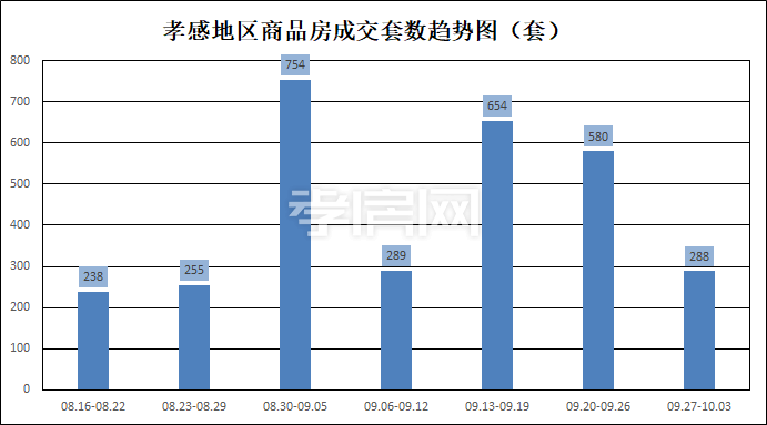 ? ? ? ?據(jù)孝房網(wǎng)數(shù)據(jù)研究顯示,從2021年09月27日到10月03日,孝感地區(qū)銷售總交易記錄288套,建面約34933.73平方米,金額為217527115.7元,均價為6226.85元/平方米。