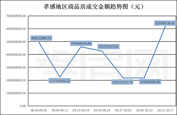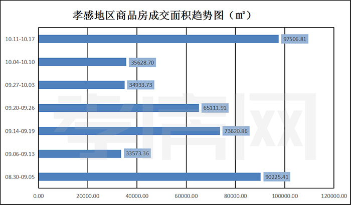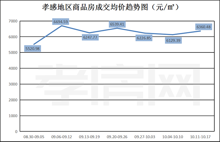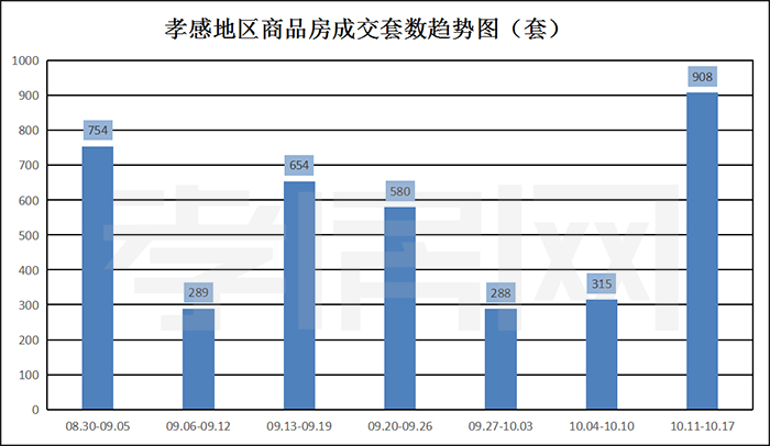 ? ? ? ?據(jù)孝房網(wǎng)數(shù)據(jù)研究顯示,從2021年10月11日到10月17日,孝感地區(qū)銷(xiāo)售總交易記錄908套,建面約97506.81平方米,金額為620189736.42元,均價(jià)為6360.48元/平方米。