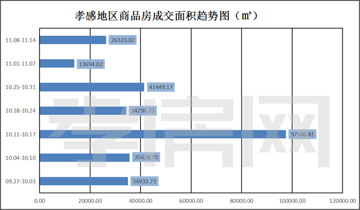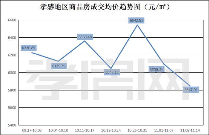 ? ? ? ?據(jù)孝房網(wǎng)數(shù)據(jù)研究顯示,從2021年11月8日到11月14日,孝感地區(qū)銷售總交易記錄234套,建面約26320.02平方米,金額為153893434.49元,均價為5847.01元/平方米。