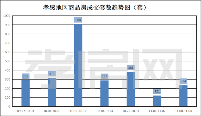 ? ? ? ?從2021年11月8日到11月14日 ,孝感地區(qū)銷售總交易記錄234套,環(huán)比上周(121套)上漲約93.39%;成交均價5847.01元/平方米,環(huán)比上周(6098.36元/平方米)下降約4.12%;成交建面約26320.02平方米,環(huán)比上周(13694.02平方米)上漲約92.2%;成交總金額153893434.49元,環(huán)比上周(83511111.46)上漲約84.28%。