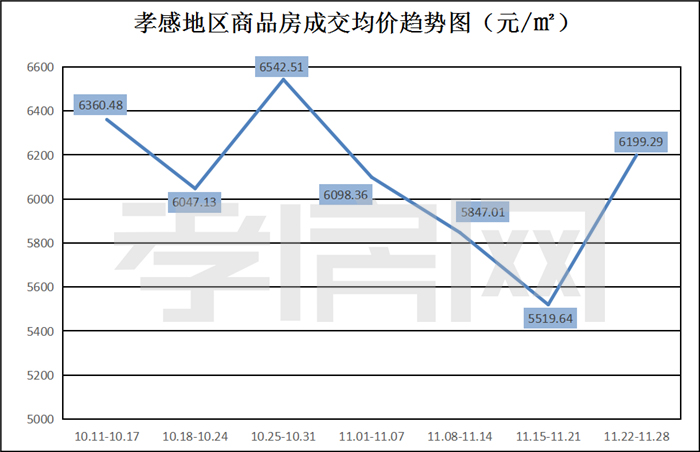 ? ? ? ?從2021年11月22日到11月28日 ,孝感地區(qū)銷售總交易記錄264套,環(huán)比上周(378套)下降約30.16%;成交均價6199.29元/平方米,環(huán)比上周(5519.64元/平方米)上漲約12.31%;成交建面約30979.89平方米,環(huán)比上周(44027.36平方米)下降約29.63%;成交總金額192053188.72元,環(huán)比上周(243015005.92)下降約20.97%。