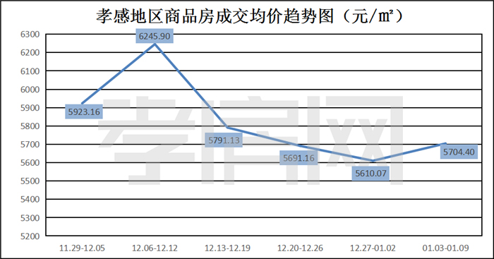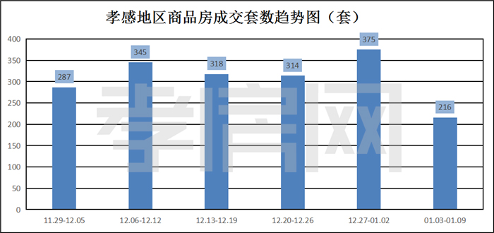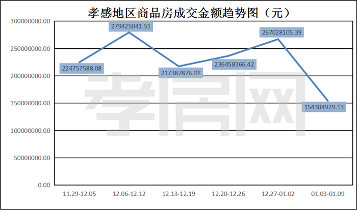 ? ? ? ?從2022年1月3日到1月9日 ,孝感地區(qū)銷售總交易記錄216套,環(huán)比上周(375套)下降約42.40%;成交均價5704.40元/平方米,環(huán)比上周(5610.07元/平方米)增漲約1.68%;成交建面約27050.17平方米,環(huán)比上周(47598.02平方米)下降約43.17%;成交總金額154304929.13元,環(huán)比上周(267028105.39元)下降約42.21%。
