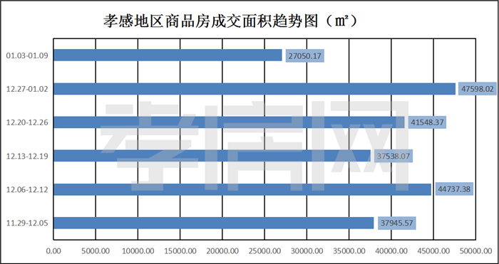 ? ? ? ?據(jù)孝房網(wǎng)數(shù)據(jù)研究顯示,從2022年1月3日到1月9日,孝感地區(qū)銷售總交易記錄216套,建面約27050.17平方米,金額為154304929.13元,均價為5704.40元/平方米。