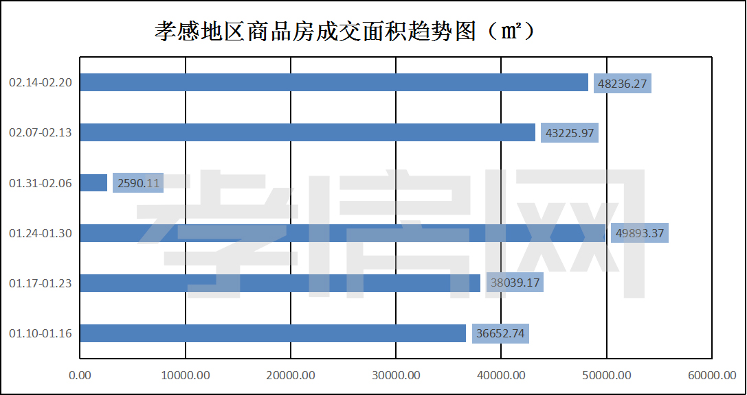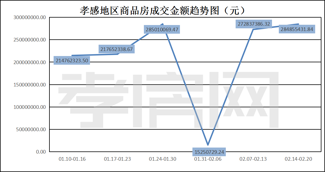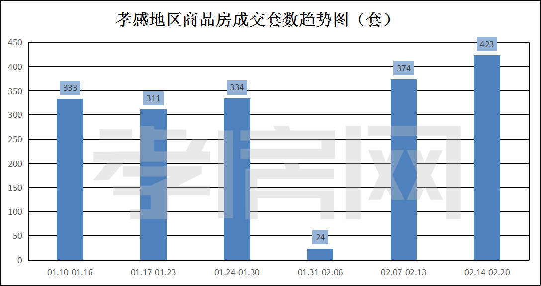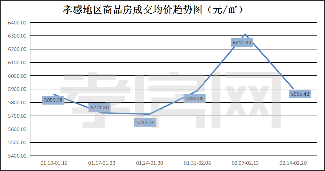 ? ? ? ?從2022年2月14日到2月20日,孝感地區(qū)銷售總交易記錄423套,環(huán)比上周(374套)上漲約13.10%;成交均價5905.42元/平方米,環(huán)比上周(6311.89元/平方米)下降約6.44%;成交建面約48236.27平方米,環(huán)比上周(43225.97平方米)上漲約11.59%;成交總金額284855431.84元,環(huán)比上周(272837386.32元)上漲約4.40%。