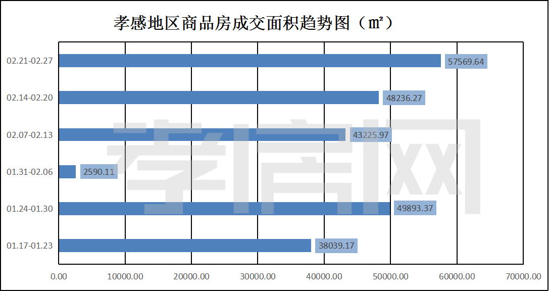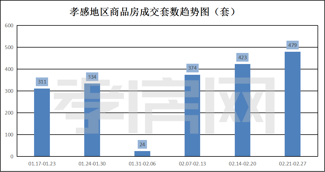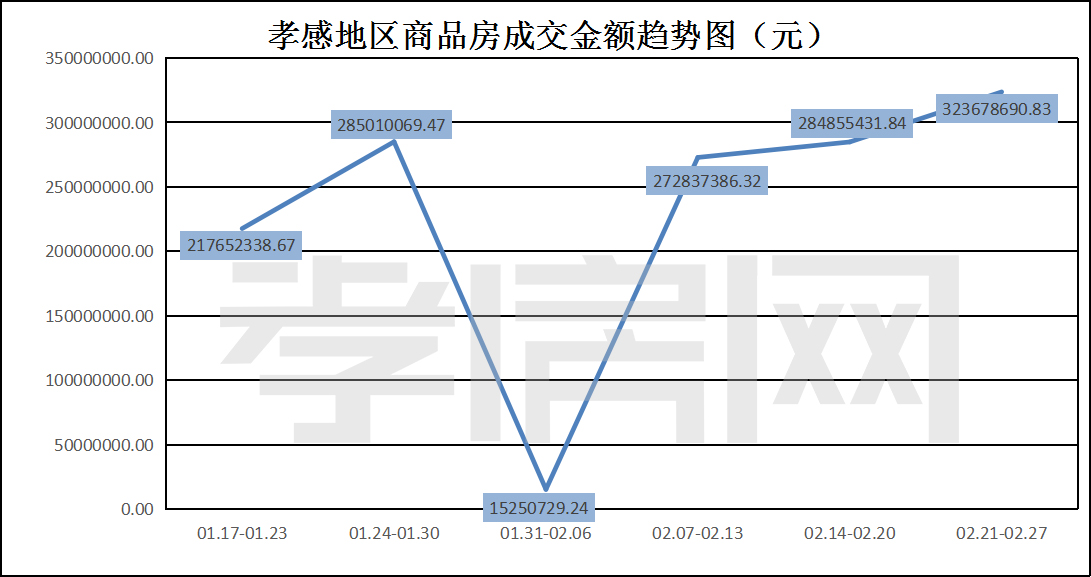 ? ? ? ?從2022年2月21日到2月27日,孝感地區(qū)銷售總交易記錄479套,環(huán)比上周(423套)上漲約13.24%;成交均價5622.39元/平方米,環(huán)比上周(5905.42元/平方米)下降約4.79%;成交建面約57569.64平方米,環(huán)比上周(48236.27平方米)上漲約19.35%;成交總金額323678690.83元,環(huán)比上周(284855431.84元)上漲約13.63%。