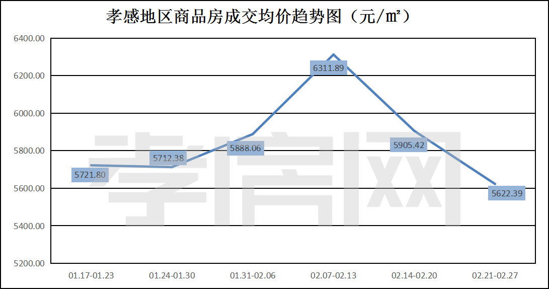? ? ? ?據(jù)孝房網(wǎng)數(shù)據(jù)研究顯示,從2022年2月21日到2月27日,孝感地區(qū)銷售總交易記錄479套,建面約57569.64平方米,金額為323678690.83元,均價為5622.39元/平方米。