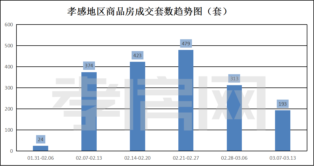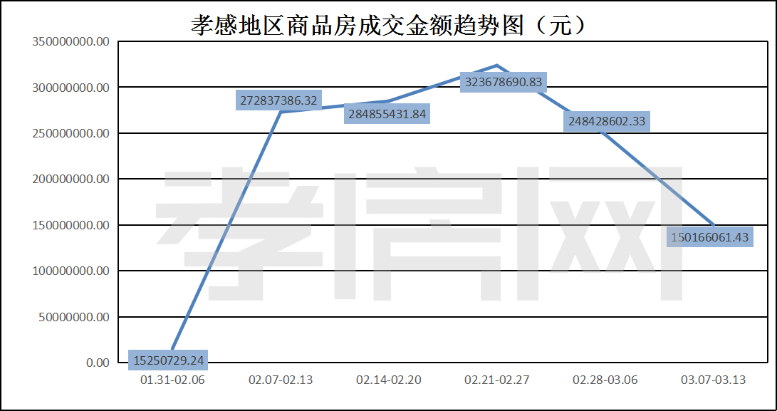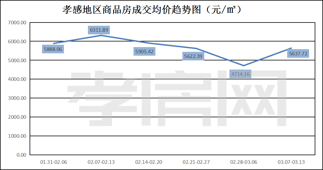? ? ? ?從2022年3月07日到3月13日,孝感地區(qū)銷售總交易記錄193套,環(huán)比上周(313套)下降約38.34%;成交均價(jià)5637.72元/平方米,環(huán)比上周(4714.16元/平方米)上漲約19.59%;成交建面約26635.97平方米,環(huán)比上周(52698.35平方米)下降約49.46%;成交總金額150166061.43元,環(huán)比上周(248428602.33元)下降約39.55%。