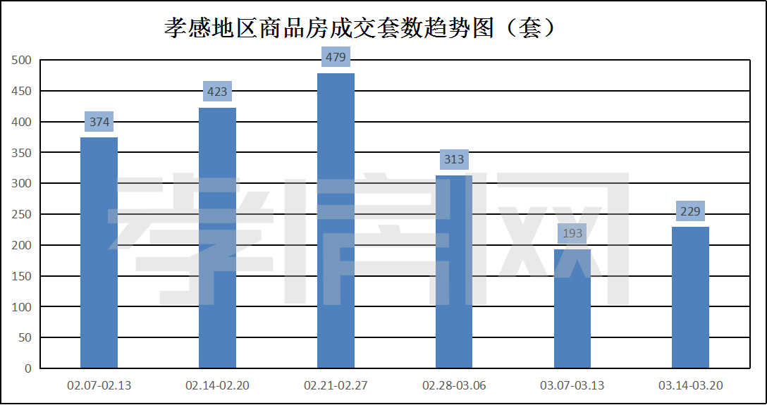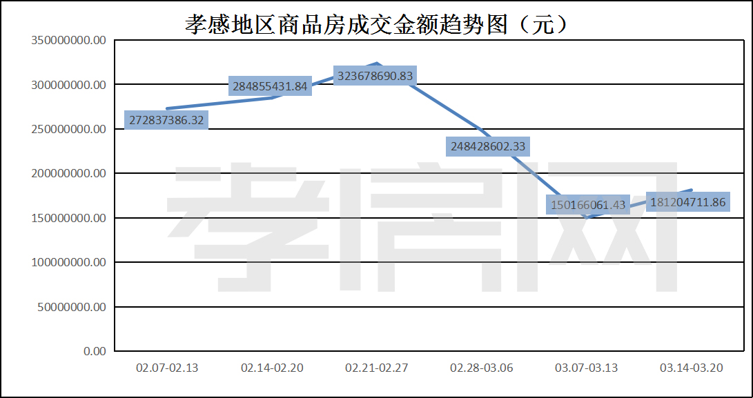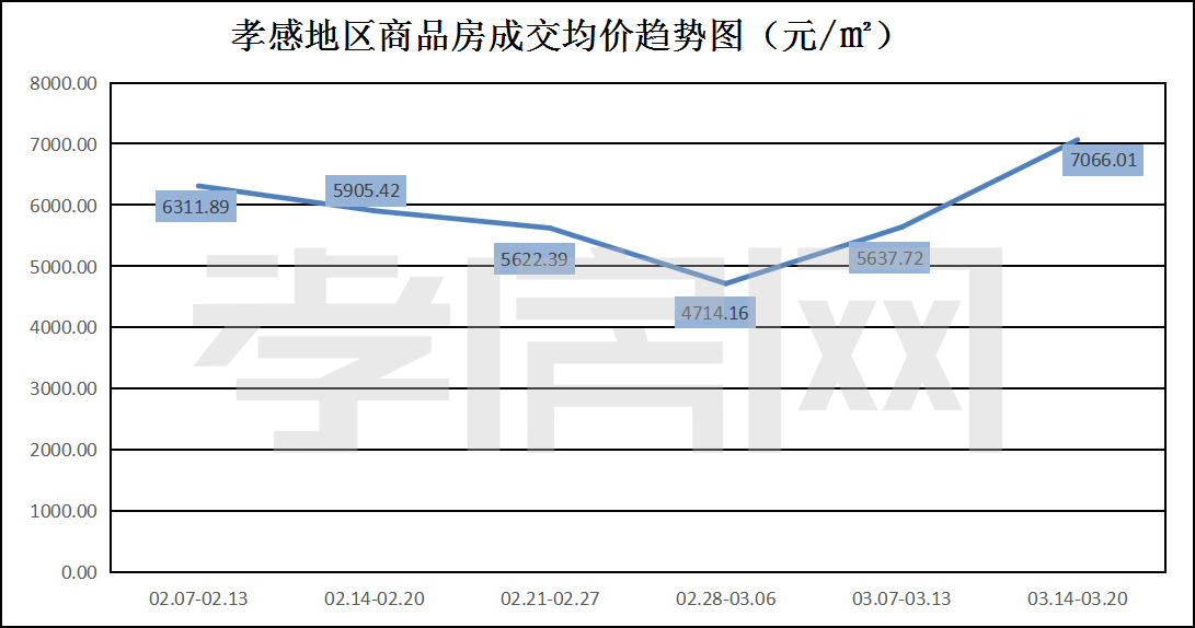 ? ? ? ?從2022年3月14日到3月20日,孝感地區(qū)銷售總交易記錄229套,環(huán)比上周(193套)上升約18.65%;成交均價(jià)7066.01元/平方米,環(huán)比上周(5637.72元/平方米)上漲約25.33%;成交建面約25644.56平方米,環(huán)比上周(26635.97平方米)下降約3.72%;成交總金額181204711.86元,環(huán)比上周(150166061.43元)上漲約20.70%。