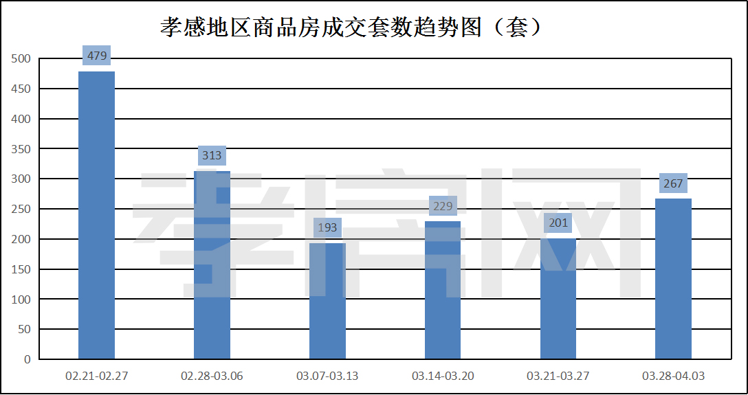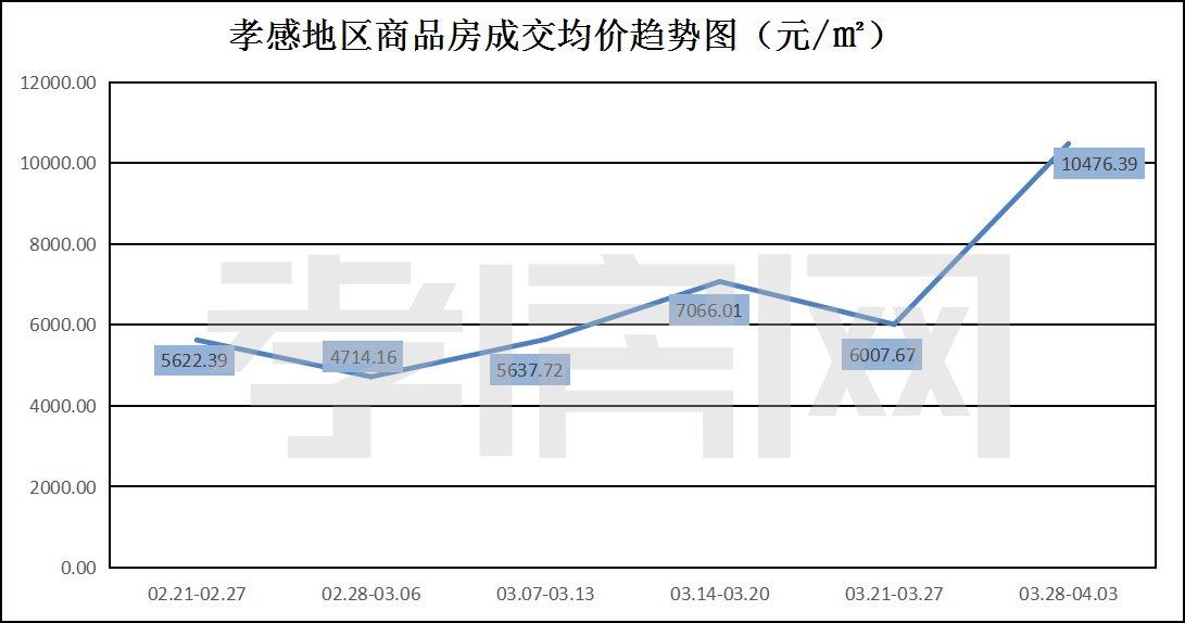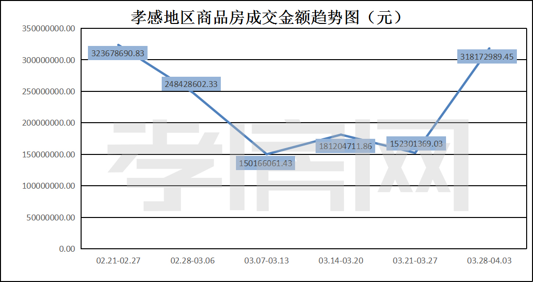 ? ? ? ?從2022年3月28日到4月03日,孝感地區(qū)銷售總交易記錄267套,環(huán)比上周(201套)上升約32.84%;成交均價10476.39元/平方米,環(huán)比上周(6007.67元/平方米)上漲約74.38%;成交建面約30370.49平方米,環(huán)比上周(25351.17平方米)上升約19.80%;成交總金額318172989.45元,環(huán)比上周(152301369.03元)上升約108.91%。
