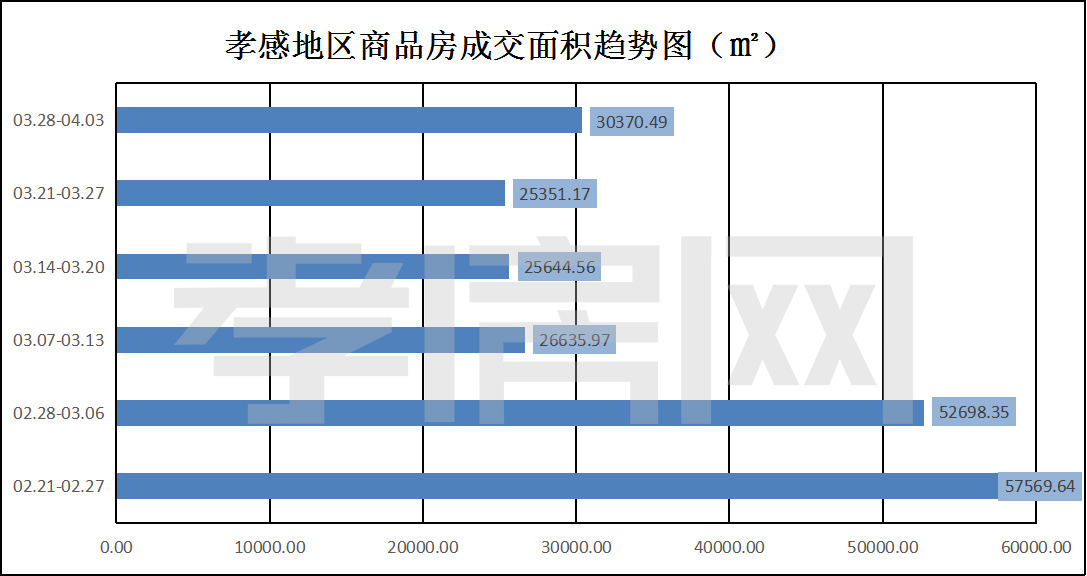 ? ? ? ?據(jù)孝房網(wǎng)數(shù)據(jù)研究顯示,從3月28日到4月03日,孝感地區(qū)銷售總交易記錄267套,建面約30370.49平方米,金額為318172989.45元,均價為10476.39元/平方米。