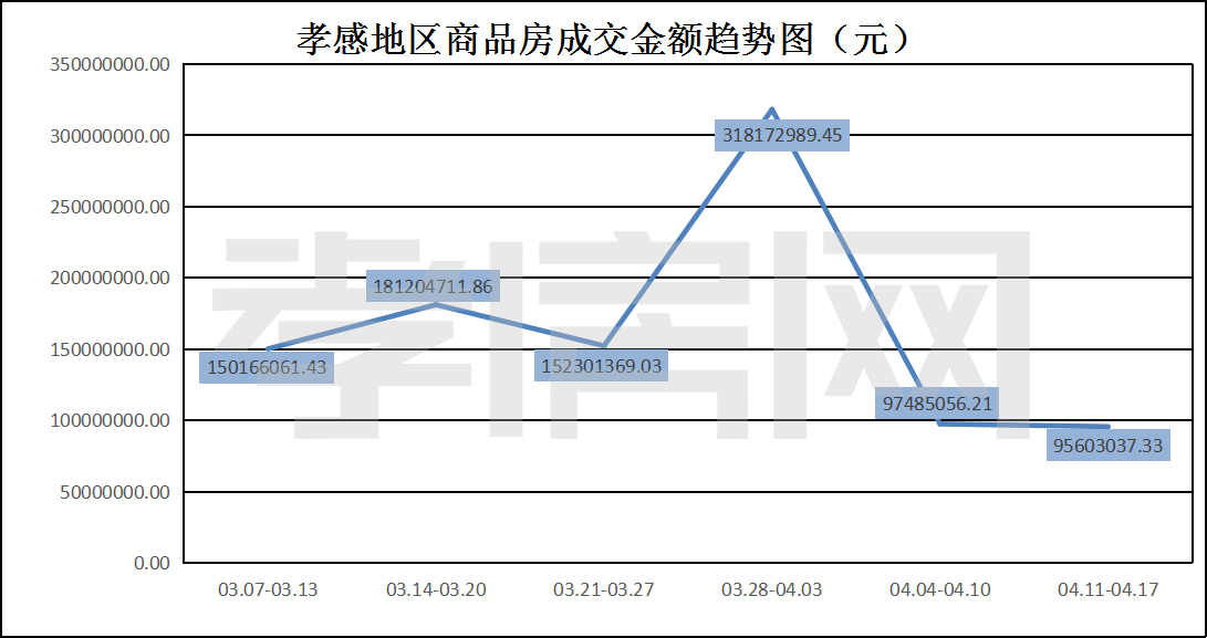? ? ? ?據(jù)孝房網(wǎng)數(shù)據(jù)研究顯示,從04月11日到04月17日,孝感地區(qū)銷售總交易記錄130套,建面約15960.73平方米,金額為95603037.33元,均價為5989.89元/平方米。