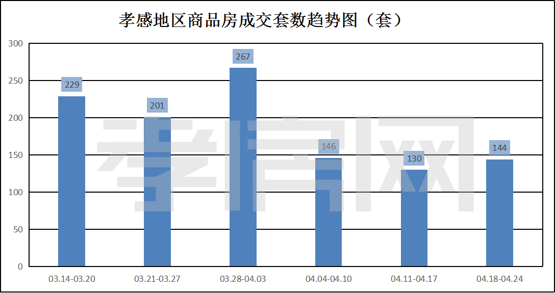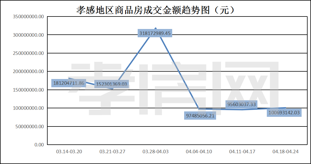 ? ? ? ?據(jù)孝房網(wǎng)數(shù)據(jù)研究顯示,從04月18日到04月24日,孝感地區(qū)銷售總交易記錄144套,建面約15593.28平方米,金額為100693142.03元,均價為6457.47元/平方米。