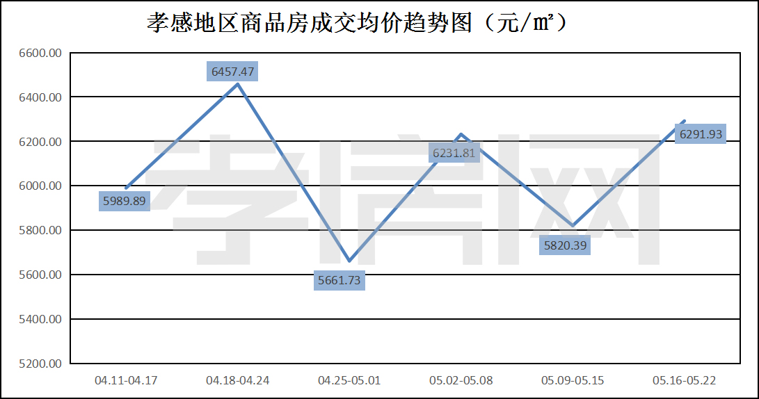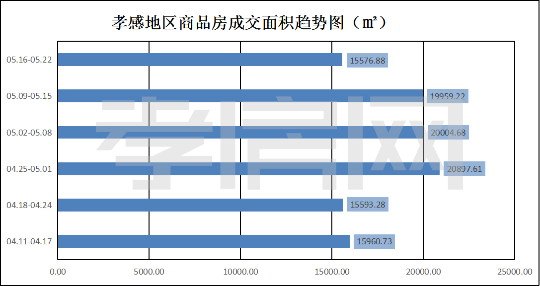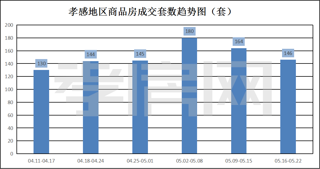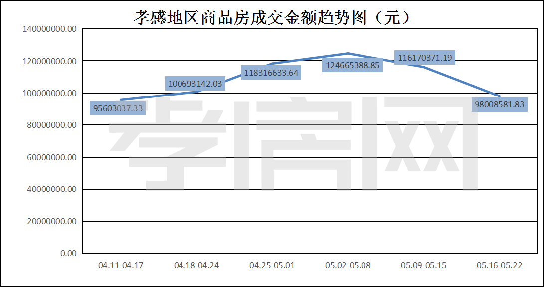 ? ? ? ?從2022年05月16日到05月22日,孝感地區(qū)銷售總交易記錄146套,環(huán)比上周(164套)下降約10.98%;成交均價(jià)6291.93元/平方米,環(huán)比上周(5820.39元/平方米)上漲約8.10%;成交建面約15576.88平方米,環(huán)比上周(19959.22平方米)下降約21.96%;成交總金額98008581.83元,環(huán)比上周(116170371.19元)下降約15.63%。